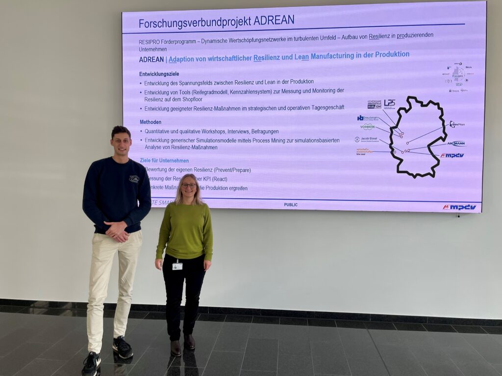 26.11.2025 Vergangene Woche hatten Laura Kirstätter (MPDV Mikrolab GmbH) und Nicolas Breuer (Lehrstuhl für Produktionssysteme) die Gelegenheit, unsere aktuellen Forschungsergebnisse und -ziele im Rahmen des EMC-Management-Forums bei unserem Projektpartner MPDV Mikrolab GmbH in Mosbach zu präsentieren.